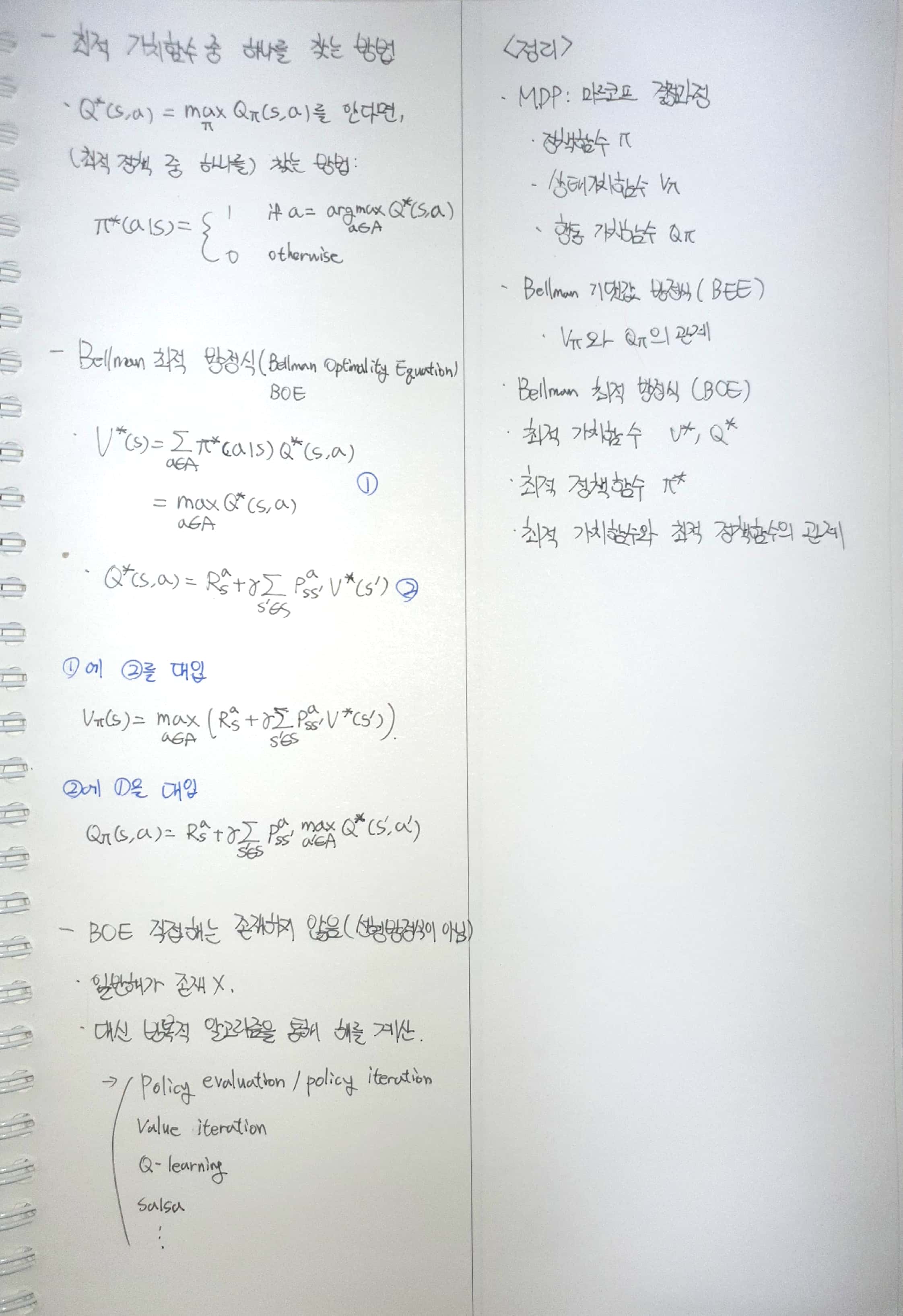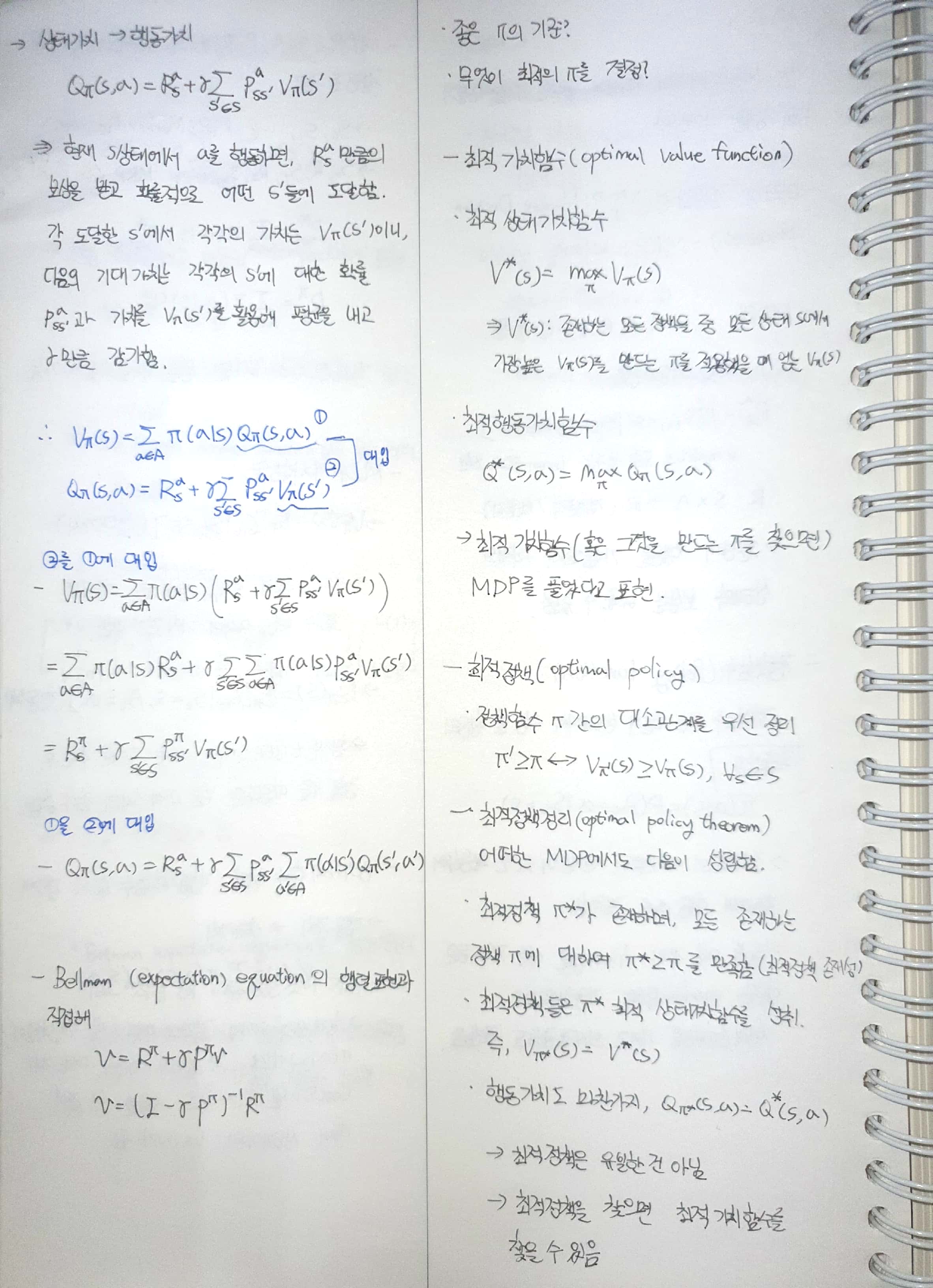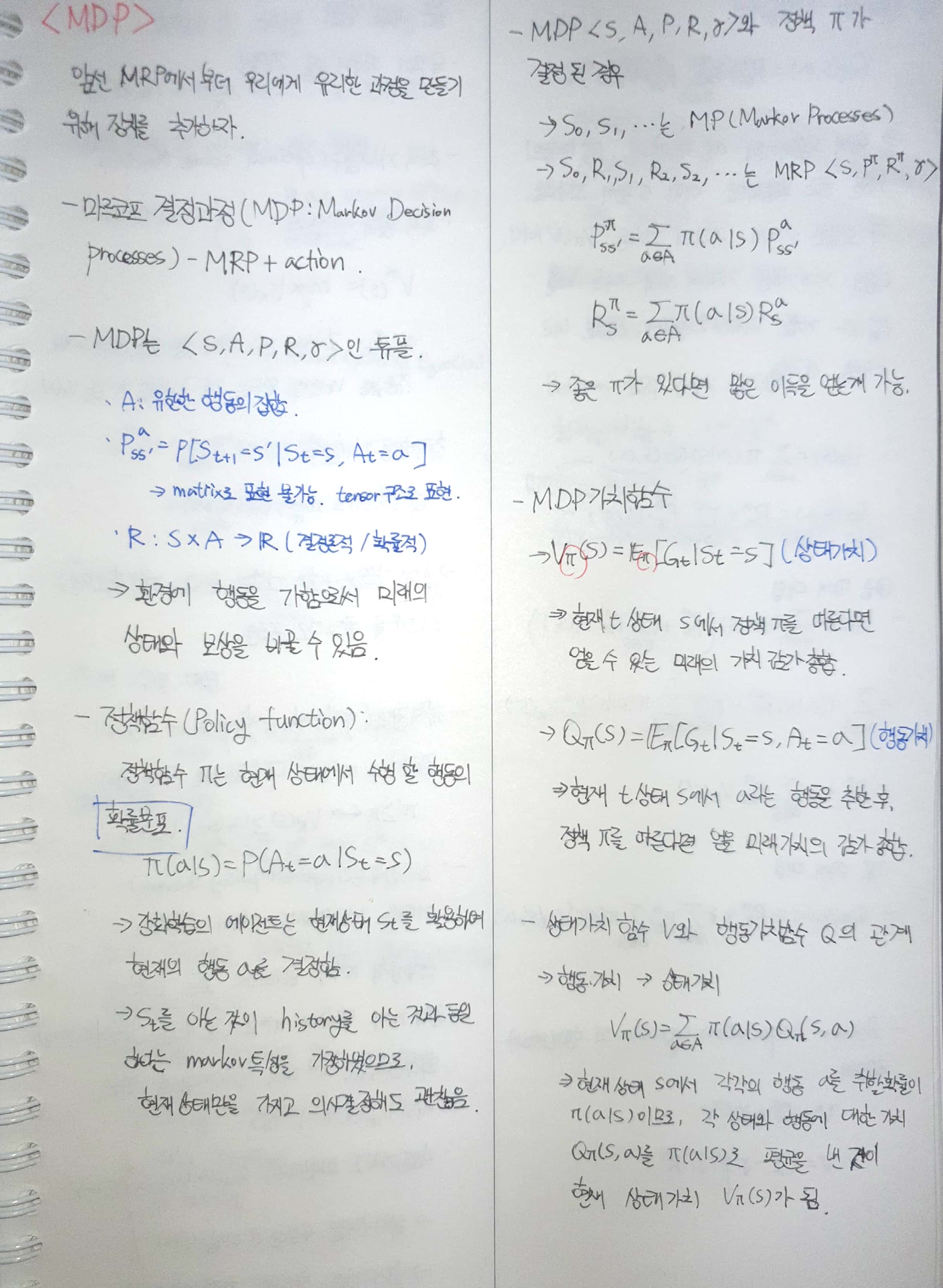 마르코프 결정 과정(Marcov Decision Process: MDP)은 강화학습 문제를 기술하는 수학적 표현방법.